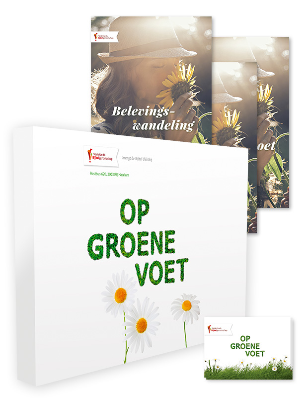 Maak je bijbel groen toolkit: Het boek Maak je bijbel groen is nu ook verkrijgbaar inclusief de Op groene voet toolkit. Deze toolkit inspireert om op groene voet te leven met de Bijbel als gids, net zoals het boek al deed. Wandelen doen we allemaal wel eens: naar de trein, in het bos of in de stad. Maar de ene wandeling is de andere niet. Daarom helpt deze toolkit om je tijdens het wandelen te laten leiden door de Bijbel. Zo wordt de Bijbel jouw gids, jouw wandelkaart. Dit is verassend en inspirerend! In de toolkit wordt gesproken over twee soorten wandelingen: een belevenis- en een zingevingswandeling. De beleveniswandeling focust meer op de beleving, de zingevingswandeling gaat wat dieper op de Bijbel in.