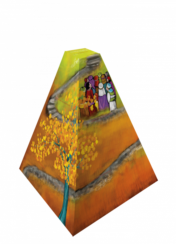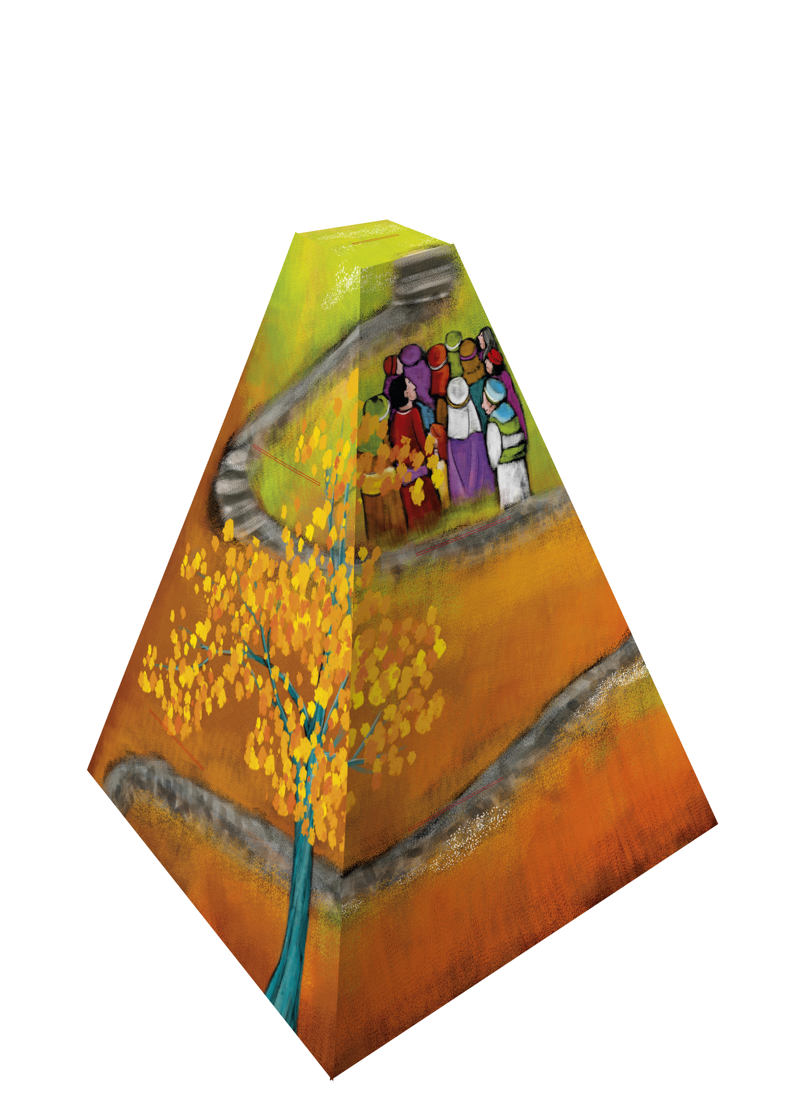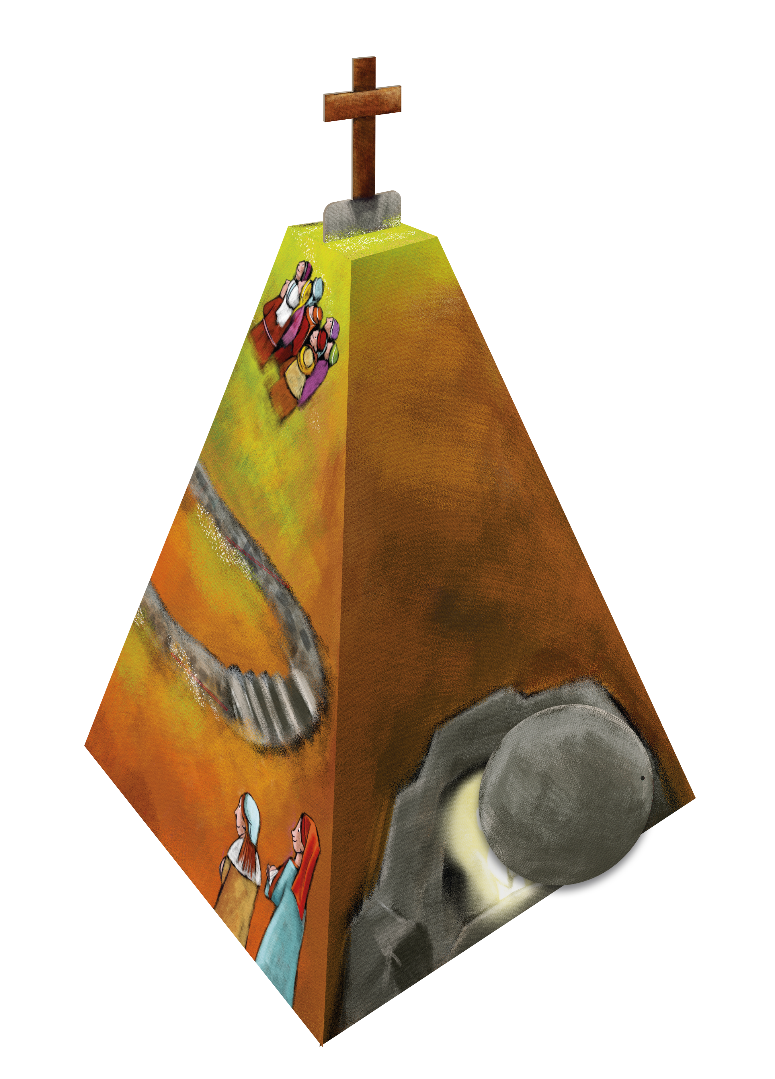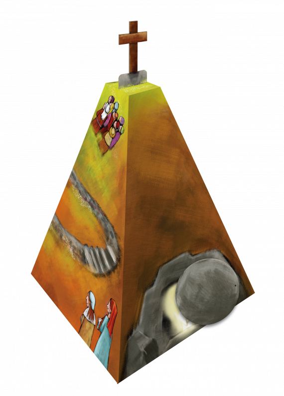 De berg heeft vier zijden. Op drie van die zijden is de weg naar boven afgebeeld. Van 1 maart tot Palmzondag worden deze kanten van de berg getoond en elke zondag aangevuld met de afbeeldingen van de voorwerpen. De vierde zijde is een bijzondere zijde. Deze kant van de berg is donkerder, en er is een grafsteen te zien. Op Goede Vrijdag draai je de berg namelijk om. Het bijgeleverde kartonnen kruis zet je vervolgens op de berg. Nu is de berg getransformeerd tot Golgotha, waar het kruis op staat. Ook zien we onderaan de berg het graf waar Jezus in is gelegd. Op Paaszondag gebeurt er iets bijzonders: samen met de kinderen mag je de ronde grafsteen opzij rollen. Die ronde steen zit met een stevige constructie aan de berg vast en kan op Paaszondag ‘weggerold’ worden. Zo kun je samen met de kinderen ontdekken en vieren dat Jezus leeft!